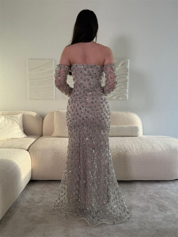 فستان سهرة فضي يمنحك حضورًا راقيًا يجسّد أعلى درجات الأناقة والأنوثة في تصميم واحد متقن. صُمم هذا الفستان ليبرز جمالك بأسلوب أنثوي متوازن، حيث يأتي بتصميم بدون أكتاف (Off-Shoulder) يمنح الإطلالة فخامة هادئة، بينما تضيف الأكمام الشفافة المطرزة توازنًا أنيقًا بين الجاذبية والرقي.