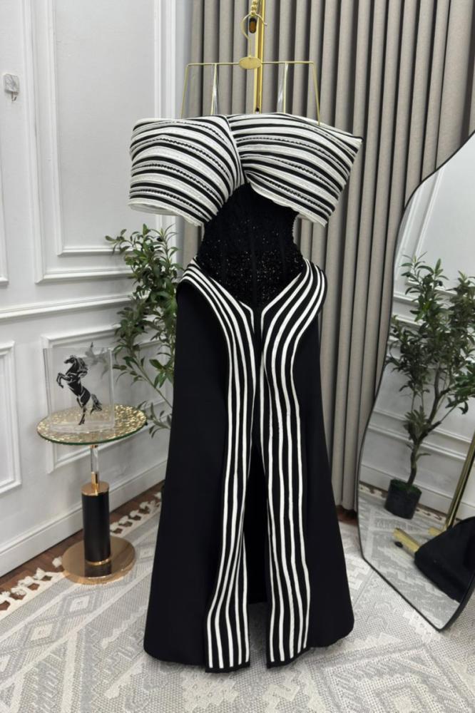 فستان سهرة أسود وأبيض يجسد الفخامة العصرية بلمسة جريئة وأنيقة، يجمع بين اللون الأسود الكلاسيكي وخطوط بيضاء هندسية تضفي طابعاً عصرياً لافتاً. يتميز بتصميم أوف شولدر يكشف جمال الكتفين مع طيات أنيقة تلتقي عند الصدر بأسلوب راقٍ.