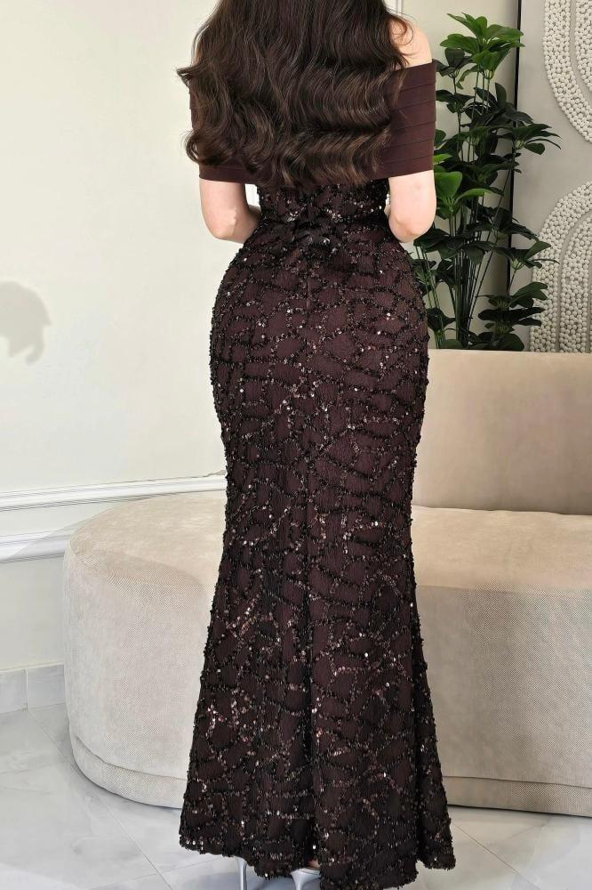 الجزء السفلي بقصّة مستقيمة محددة للجسم ينسدل بانسيابية جذابة، ومزيّن بتطريز لامع متقن بنقوش هندسية أنيقة يضيف عمقًا بصريًا وفخامة واضحة. اللمعة الهادئة مع اللون البني الداكن تجعل هذا الفستان الأوف شولدر خيارًا مثاليًا للسهرات المسائية والمناسبات الخاصة التي تتطلب حضورًا أنيقًا ومميزًا.
