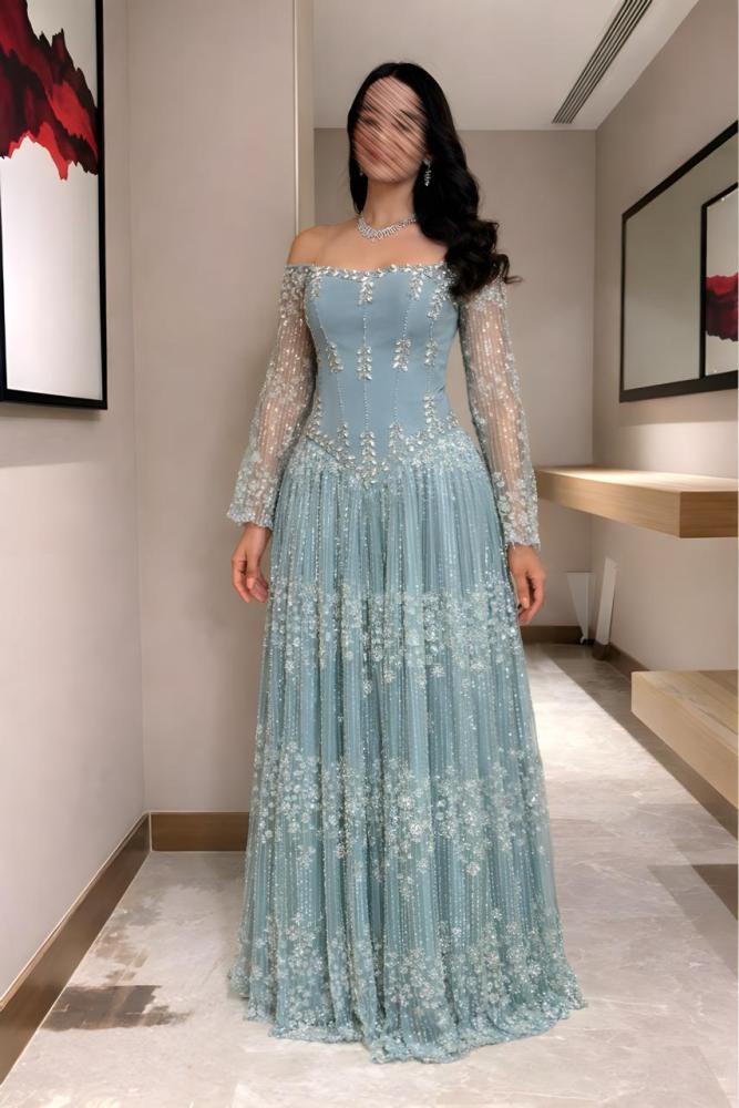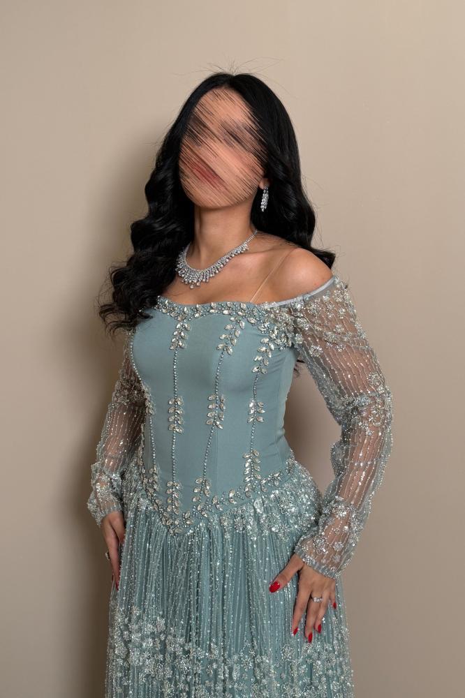 الأكمام مصنوعة من دانتيل شفاف مطرز بدقة، تضيف نعومة وفخامة للتصميم، مع ياقة أوف شولدر أنثوية تبرز جمال الكتفين والعنق. أما التنورة فهي من التول المطرز بطبقات خفيفة ومنسدلة تنسدل حتى الأرض لتمنحك حركة راقية ومظهراً ملكياً في كل خطوة.