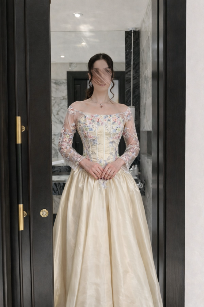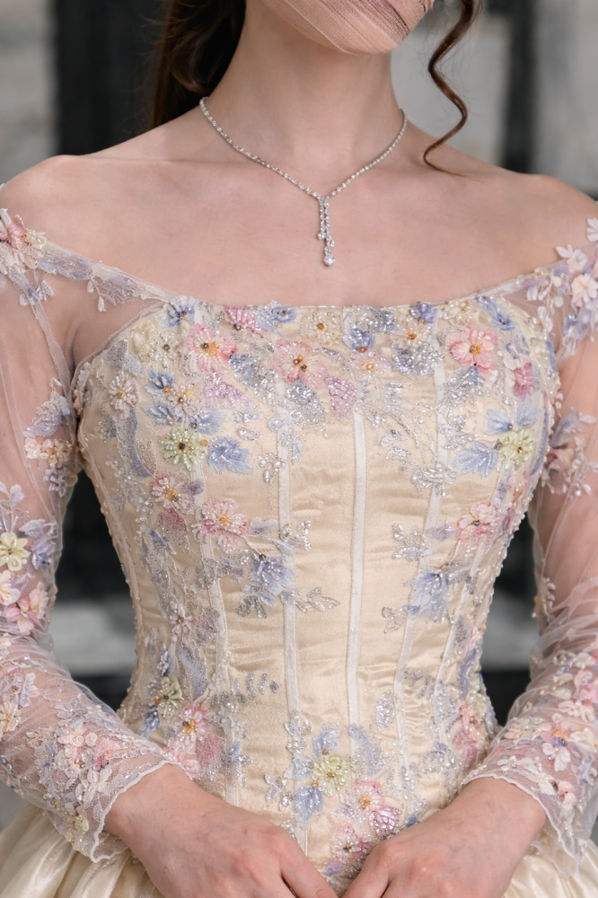 فستان سهرة فخم أنيق يجسد الرقي الكلاسيكي بلمسة عصرية، يتميز بجزء علوي على شكل كورسيه ناعم بلون شامبانيا مطرز بتفاصيل زهور ثلاثية الأبعاد بألوان باستيل رقيقة مع تطريزات لامعة تضفي فخامة ناعمة.