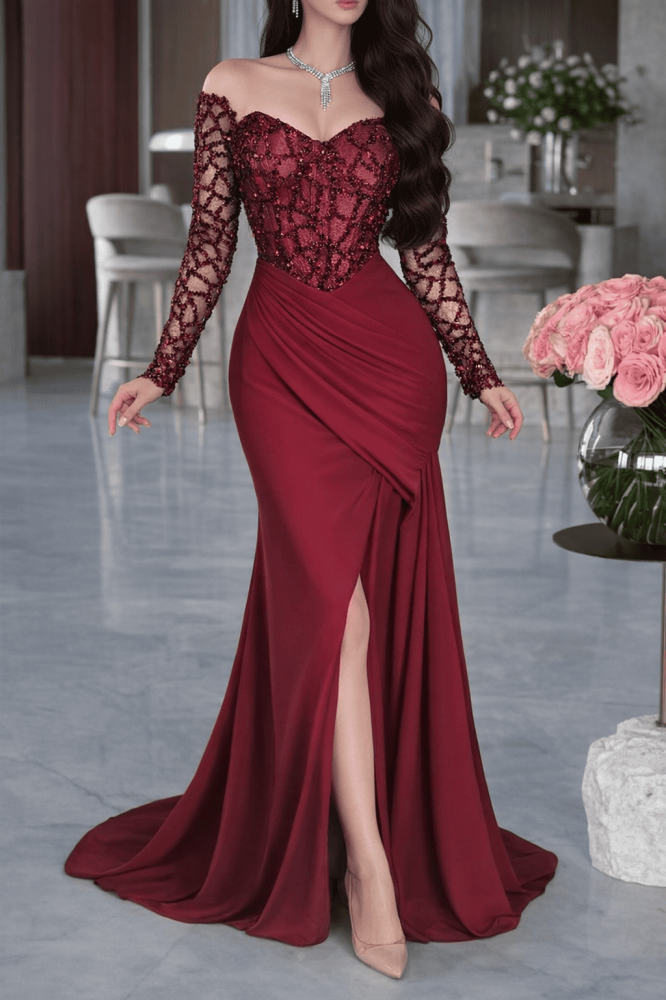 فستان سهرة عنابي، فستان مطرز فاخر، فستان أكمام شفافة، فستان شق أمامي، فساتين سهرة راقية، فستان نسائي أنيق، فستان مناسبات فخم، فساتين سهرات طويلة، فستان خطوبة أنيق