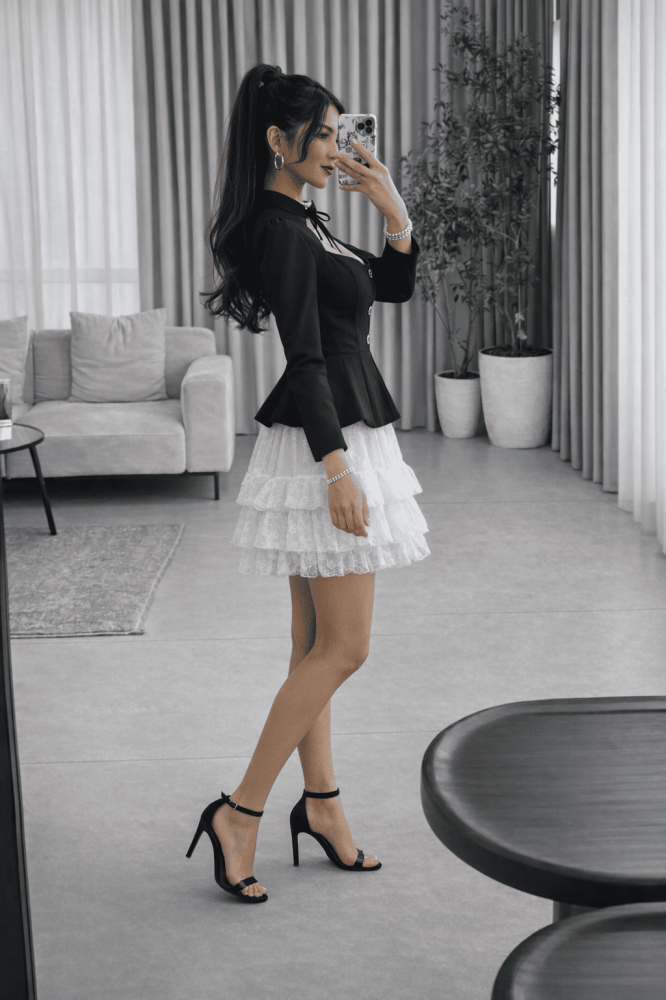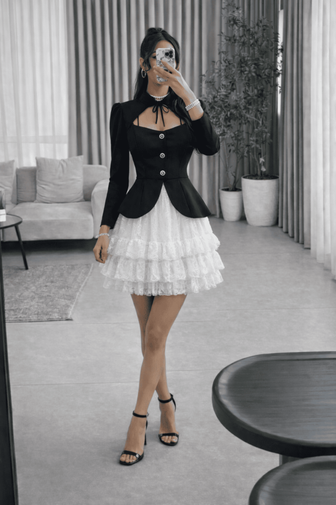 • فستان قصير بتصميم ثنائي اللون يجمع بين الأسود الكلاسيكي والأبيض الناصع في تناغم أنيق.