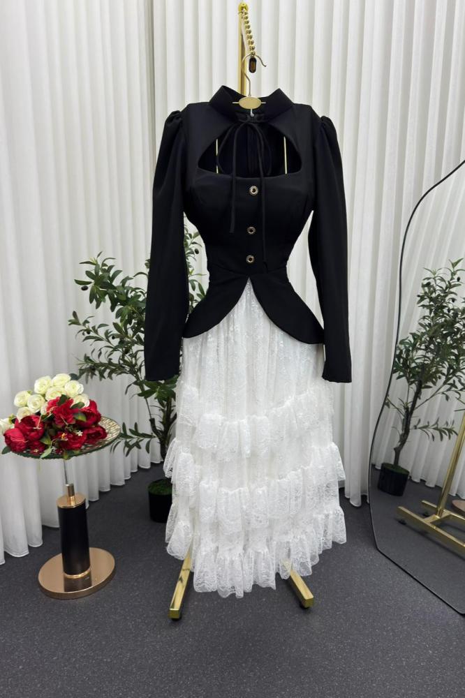 • الجزء العلوي يأتي بقصة كورسيه محددة للخصر باللون الأسود مع أزرار أمامية أنيقة، وأكمام طويلة وياقة مزينة بربطة ناعمة تضيف لمسة أنثوية فاخرة.
