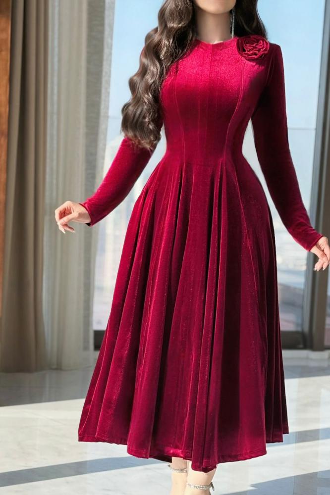 فستان مخمل عنابي ميدي بقصّة أنثوية ولمسة وردة أنيقة