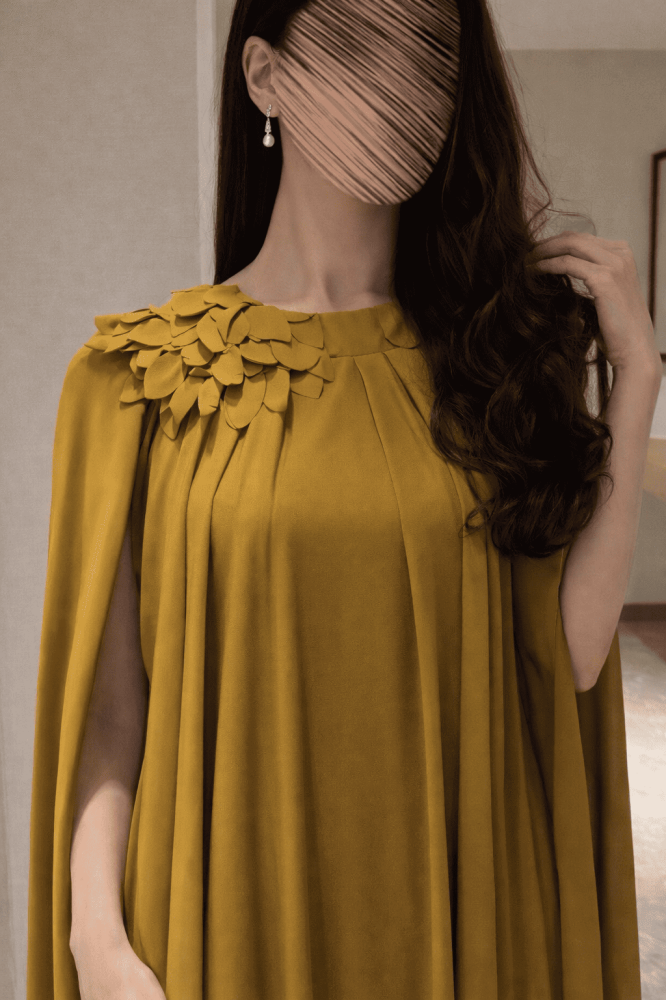 فستان سهرة أنيق يجسد الفخامة الهادئة بأسلوب عصري راقٍ. يأتي بلون موستارد دافئ يضفي إشراقة ناعمة على البشرة، مع قصة واسعة تنساب بسلاسة لتمنحك راحة وأناقة في آن واحد. يتميز بتصميم كاب متصل بالأكمام ينسدل برقة، مما يضفي لمسة ملكية وحضوراً لافتاً.